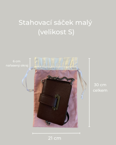 malý sáček (velikost S) šířka 21 cm X výška 30 cm celkově, řasený okraj výška 6 cm
