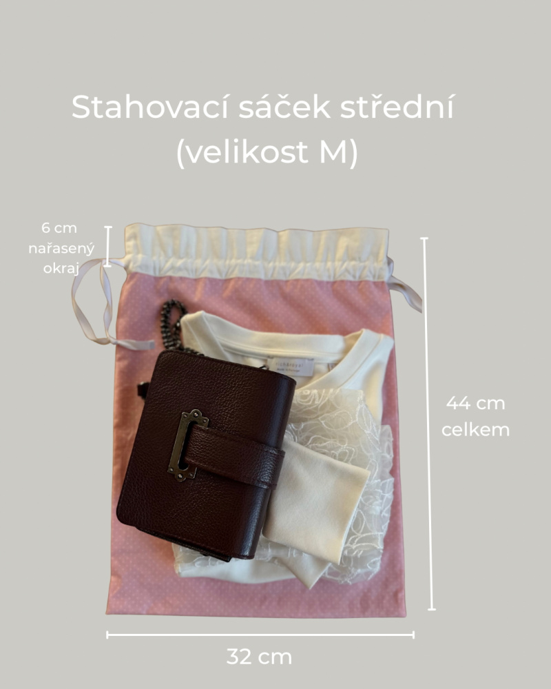 střední sáček (velikost M) šířka 32 cm X výška 44 cm celkově, řasený okraj výška 6 cm