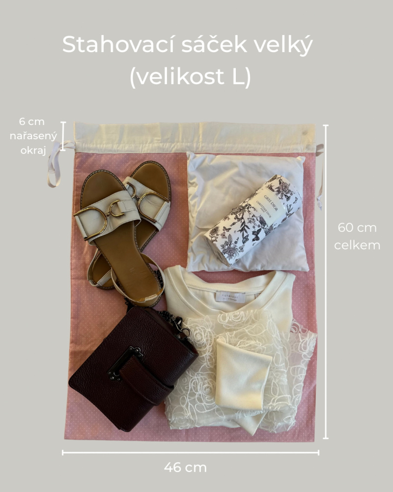 velký sáček (velikost L) šířka 46 cm X výška 60 cm celkově, řasený okraj výška 6 cm